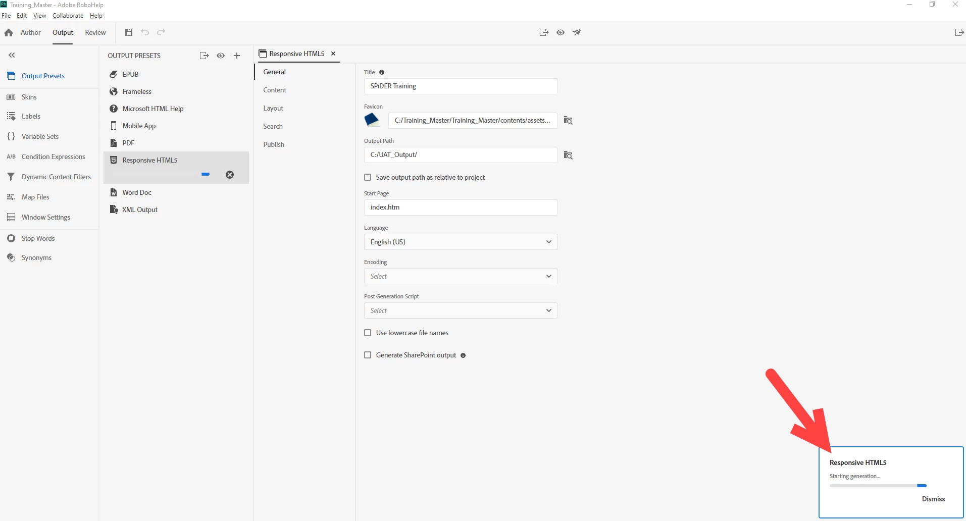 I updated Rh to 2020.8.34 last week. I cannot get the Responsive HTML5 Output to produce anything. It just stays at Starting generation...