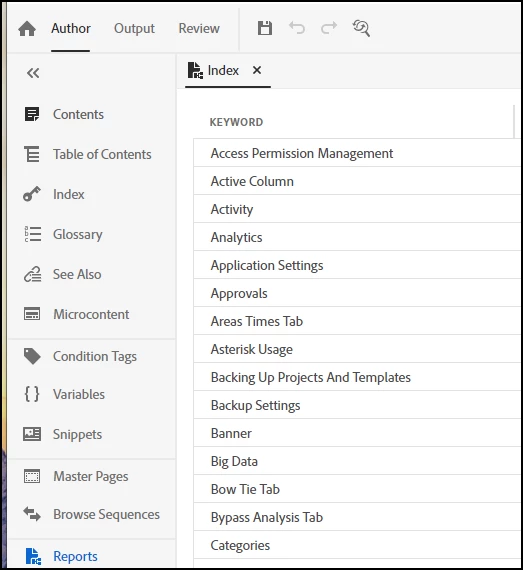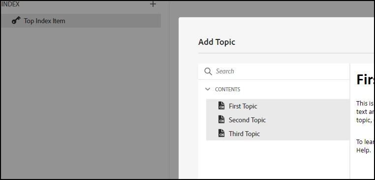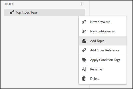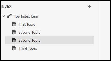 - I can add multiple topics using the context menu option, but I cannot locate a way to add multiple topics at the root level of the index. The topics keep being added under another topic. When I click on the "+" in the top right, and click on the options button, the field disappears.