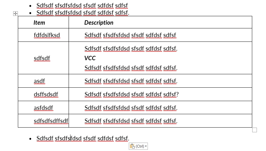 This only applies to Word. The output is fine in PDF and HTML. I sometimes want a table within a list. I've tried creating the tables directly in the li tag and putting them in a p tag within an li tag but I get the same results. The text in the table does not line up with the border of the table and if there is text formatting like bold, it cause the text after the formatted text to appear on a new line.
