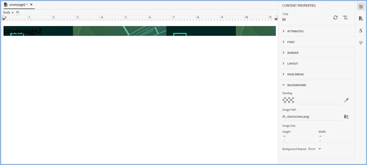 I want to add a background image to my front cover. I try specifying an image path in background for my topic but it does not display the image. When I went to the source I saw that it added the background-image to a pargraph. So I moved it to the body and now the image displays in the topic in RH but when I preview it or generate the PDF, the image is not there.