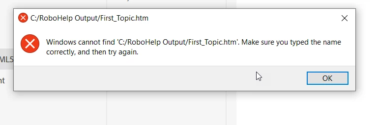 New to using RH2020. Struggling to generate output. I get a message that says, "Windows cannot find 'C:/RoboHelp Output/First_Topic.htm' " Not sure what to do next - attaching a couple of screen shots.
