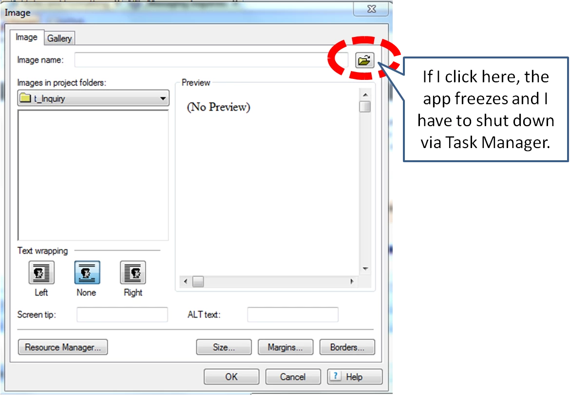 I have tried accessing the "Insert Image" option using the various methods (menu, toolbar icon, right click menu), but once the dialog box is open, I click on the browse folder to find the image that I added via Explorer, but nothing happens and the app freezes.  The only thing I am able to do is close RH via the Task Manager.  I have tried rebooting and also tried doing this in multiple projects to make sure it's not my main project with the problem.  This same thing happens every time.