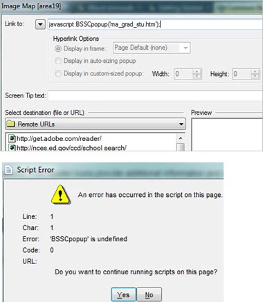 Links in the generated map show the obvious script error (figure 2). What happened? I didn't switch settings, it's a solo project, nothing downloaded to my machine over the weekend. Is there a way to lock the settings and hot spot areas, or do we just need to check image maps prior to distributing Webhelp?