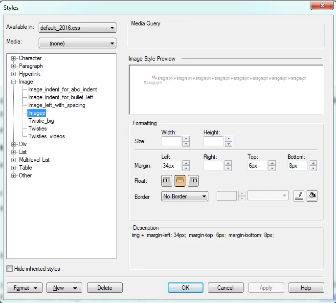 I've successfully pulled my projects into RH2015, but my image styles won't apply. So I copied my CSS from RH11 and used it in RH2015. The image styles are in the CSS, but I cannot apply them to any new images I bring in, and when I generate, a 'P' style is being applied to all my images. All the rest of the styles seem to be applying just fine. This is how it appears when I inspect: