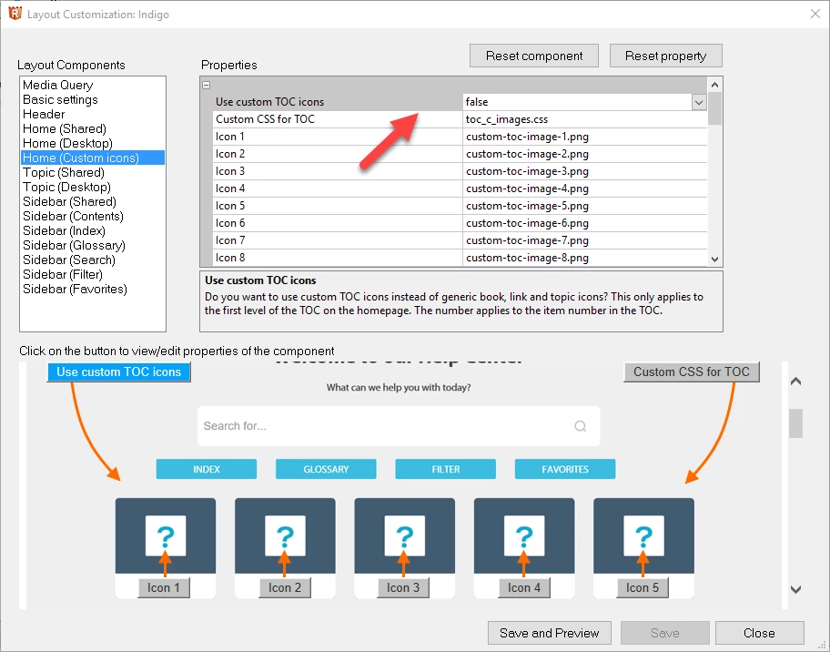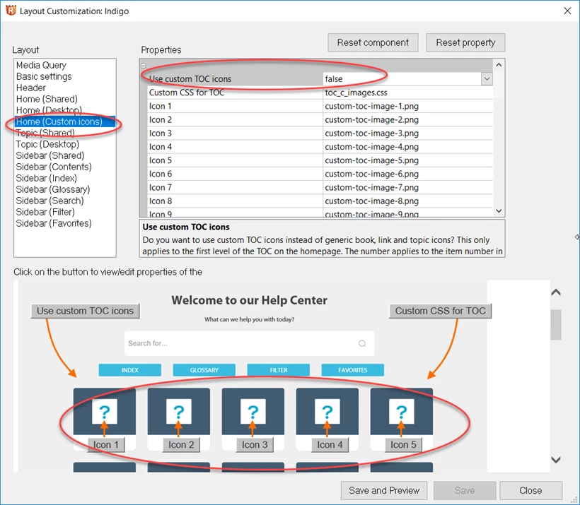 I am exploring the Indigo layout in a trial of RH 2017. In my trial copy, there's a Layout Customization section where you can customize the icons that show on the tiles of the main/home help page (I think RH calls it the landing page). However, according to this page Issues resolved in Adobe RoboHelp (2017 release), that part of the Layout Customization window is going away with Update 2 of RH 2017. The page says "The Home (Custom Icons) component in the Indigo layout is no longer available. With this, customizing TOC icons for the landing page is not possible through the Layout Customization interface. You can still customize the landing page icons through CSS."