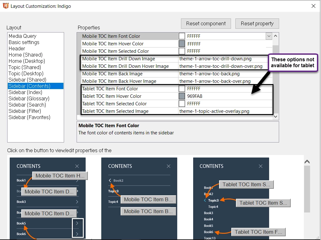 From what I can tell, there are no drill-down TOC images available for desktop or tablet views in the Indigo responsive layout. In the editor within RoboHelp, it looks like drill-down images are only available for the mobile view (see first screenshot below). I have a large help system with many topic levels and would like drill-down arrows to appear in all views, not just mobile.