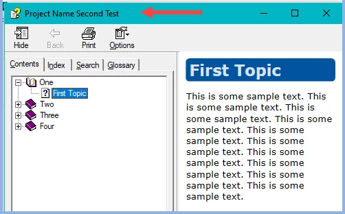 Hello, where can I change the title of the chm file (the main project of a merged chm project)? I've read the posts for the old versions. Would think it is by creating a window settings. Inserting a space in de name is immediately replaced by an underscore. So the real title is not there. Anyhow I change another bit there (left out glossary) and save it.
