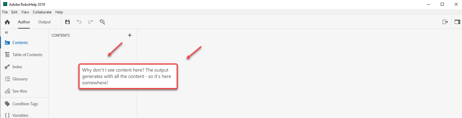 When I open my Robohelp2019 project, I don't see any TOC contents in the author mode (it's just a blank project). But if I generate the project, I am able to view the entire contents in the Frameless output. I used to be able to view the contents, I don't know what I did to 'hide' the view. Can anyone help? Attaching a picture of my open RH project (that actually has content - you just can't see it!).