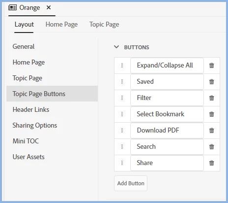 I have a frameless output. In the topic page in the right panel at the top there are Expand All, Favorites, Filter, Share, and Dark (moon icon) buttons.