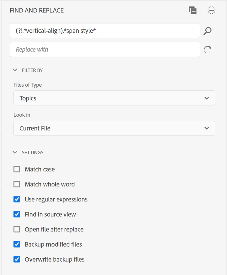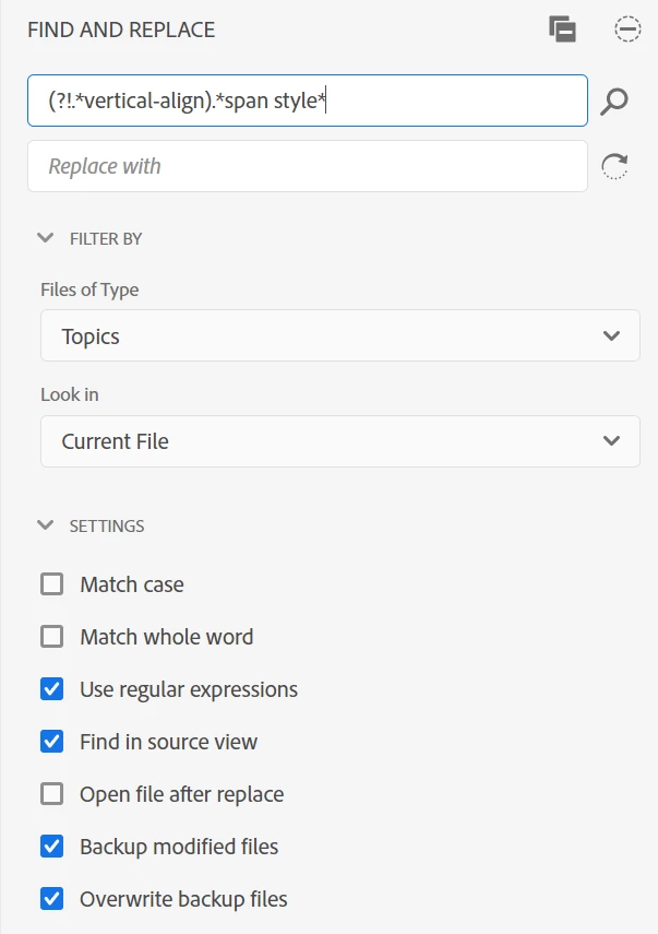 I am using RH2020 Update 5 and trying to fix some of my code in the source code. For this, I wanted to use a regular expression. The expression itself seems to be correct (at least, I get the desired results when using it in Notepad++), but the search in RH only keeps on running without returning any results. I tried it with the complete project and also only with one topic open.
