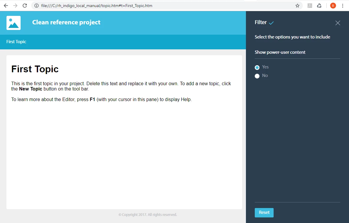 I'm currently working on getting our RoboHelp 2017 (Update 2) project to compile properly via RHCL. In our project, we use a heavily customized version of the Indigo layout. I noticed that, when I use RHCL to compile the project via the command line, the Filter buttons and panes (on Start and Topic pages) are not included in the output, even though dynamic content filters are activated in the used Output Setup and Layout.