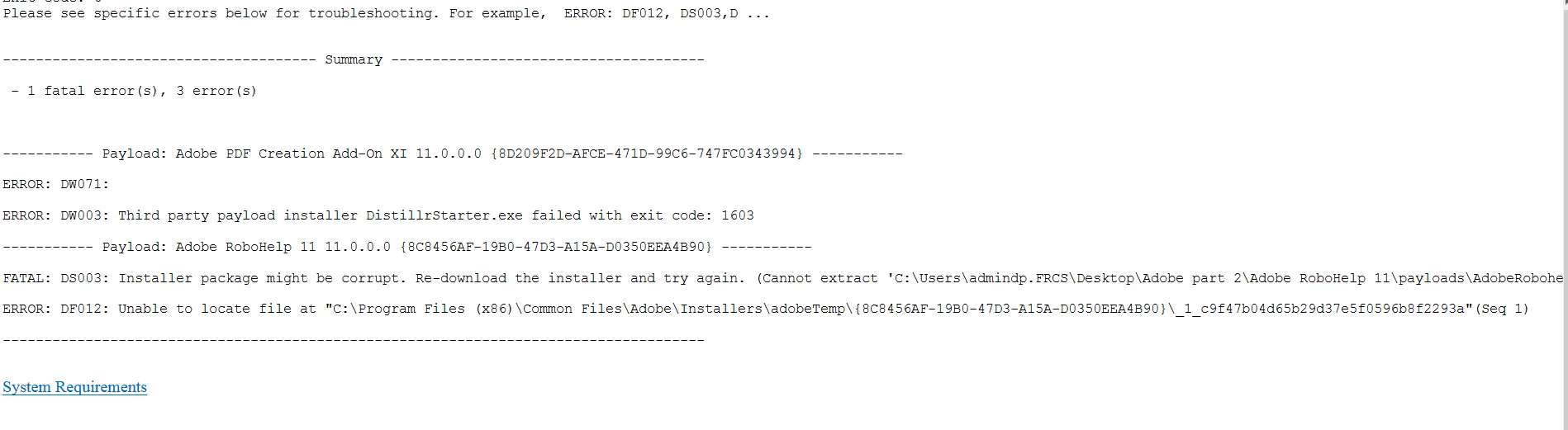 RoboHelp 11 installation errors DS003, DF012, DW071 and DW003