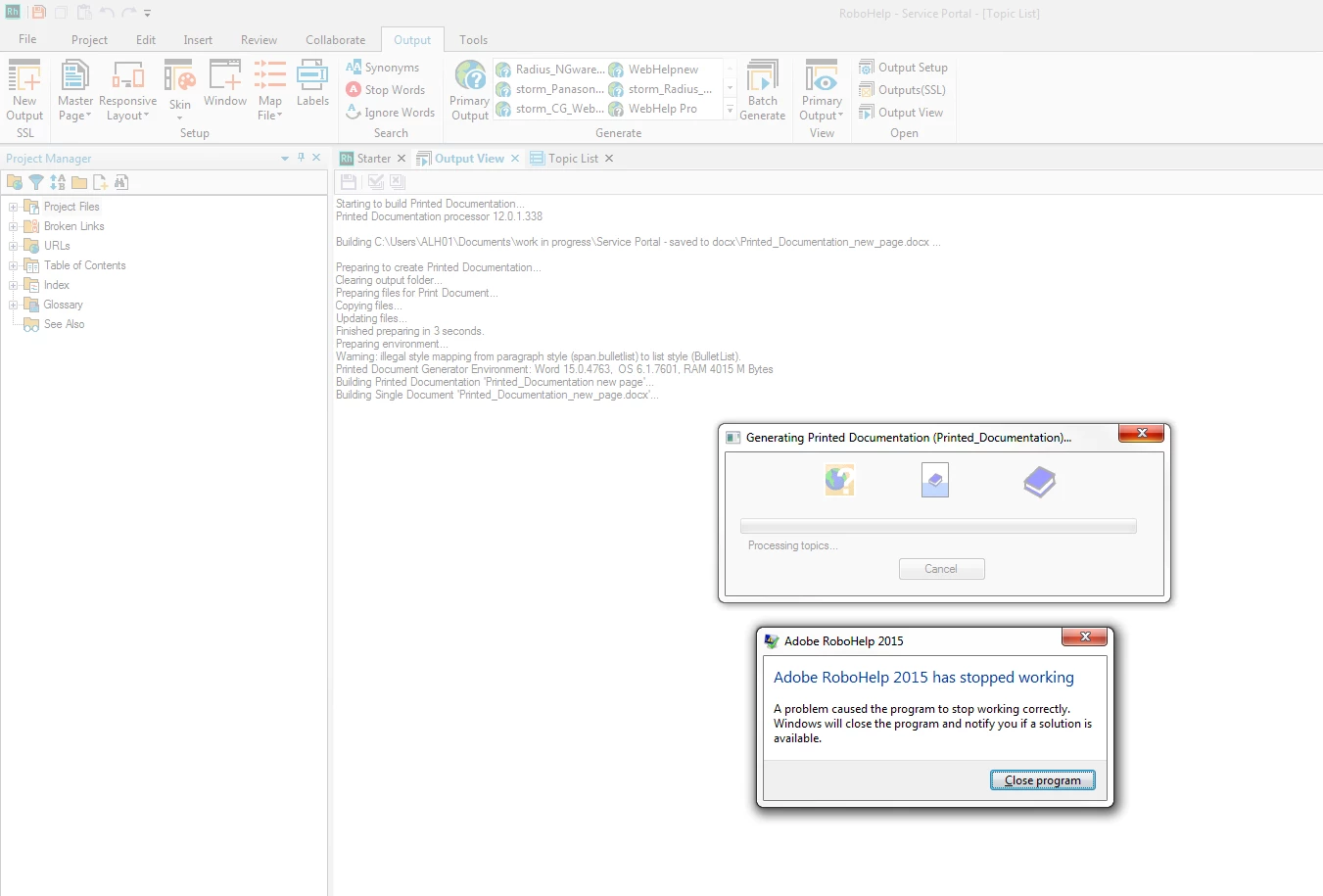 RoboHelp 2015 crashes when try to create a docx file