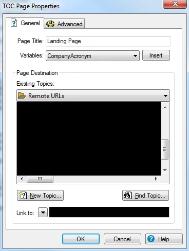 I am trying to create a topic that links to a webpage in Robohelp 2015 using the responsive HTML5 output; however, whenever I view the output and select the topic, I get the error listed below the TOC Page Properties screenshot. The link works if I paste it into a browser, though. Can anyone help me understand what I'm doing wrong? I often do this in Robohelp 10.