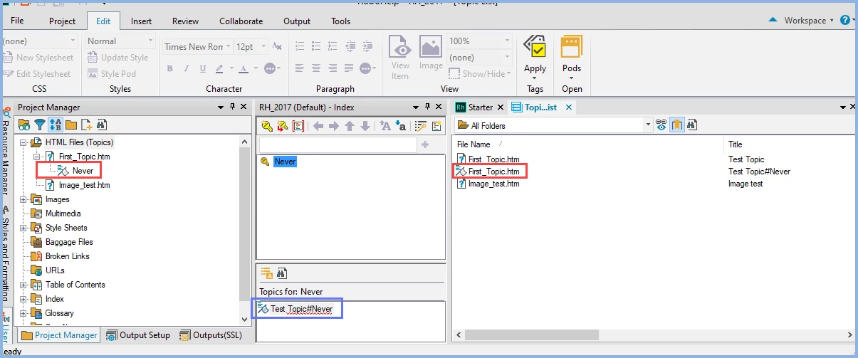 As for bookmarks in the Index. I foudn two ways to add things. Add Keywords and Subkeywords using the Index Pod. From the Topic List I am able to drag topics to the Index however, I am unable to drag Bookmarks.