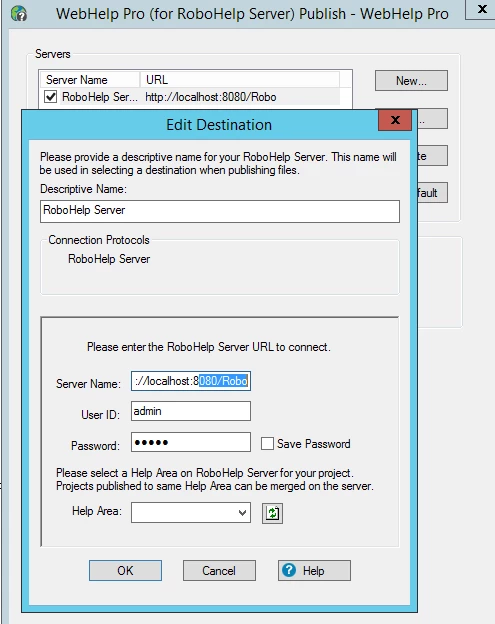 I use this URL (http://localhost:8080/robohelp/server ) for the server name since both Robohelp & sever are on same PC.