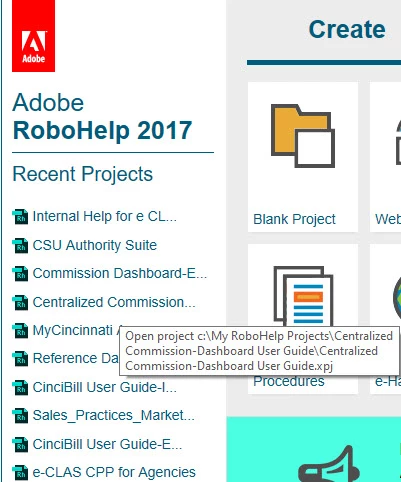 RoboHelp 2017 - Recent Projects links do not work correctly.