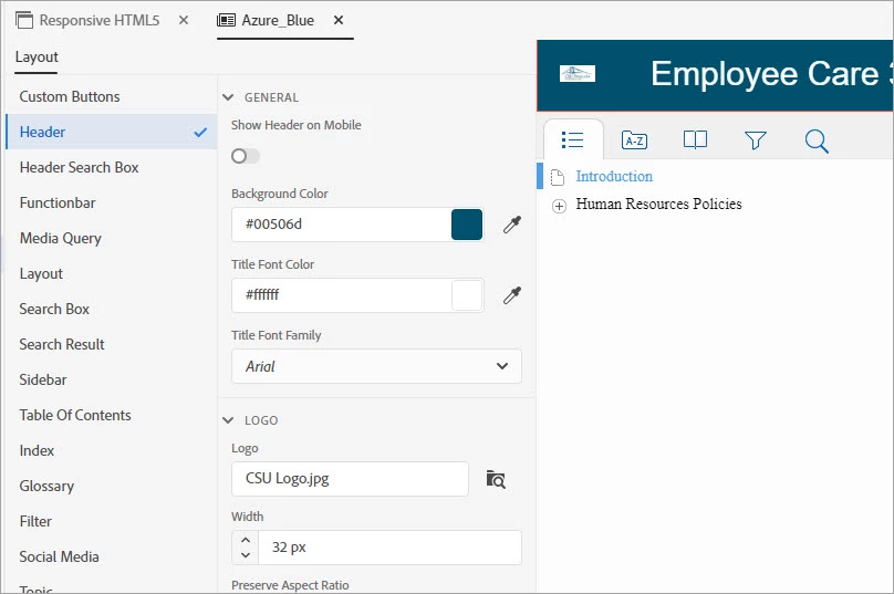 I set up the Responsive HTML5 Layout and set the skin to Azure Blue. I edited the skin and went to Header. I uploaded a Logo.
