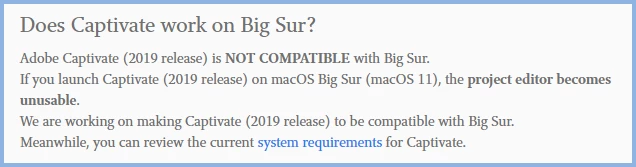 My computer is a MacBook Pro i7 (Late 2013) - yes, quite an old machine but working fine with Big Sur and anything else except of RoboHelp 2020 and Captivate 2019 (for Captivate, there is a notification in the regarding Adobe Community section).