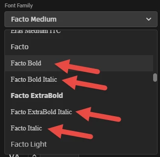 While I definitely can apply "Bold" or "Italic" to the base "Facto" font in RH via a style, the end-result is slightly different than the dedicated font. For this reason, I would like to be able to use the dedicated "Facto Bold" or "Facto Italic" fonts instead.