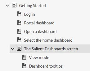 I was excited to see new options in RoboHelp 2022: Readjust heading levels as in the source TOC hierarchy and Add or replace heading from the source TOC to maintain the hierarchy options. In fact, I was able to use these in one fairly simple project to eliminate the messiness. This project only had two levels in the TOCs. Now in a bigger project, I am realizing that these options are not working for lower level sections. For example, here the "The Salient Dashboards screen" section is underneath the "Getting Started" section in the TOC.