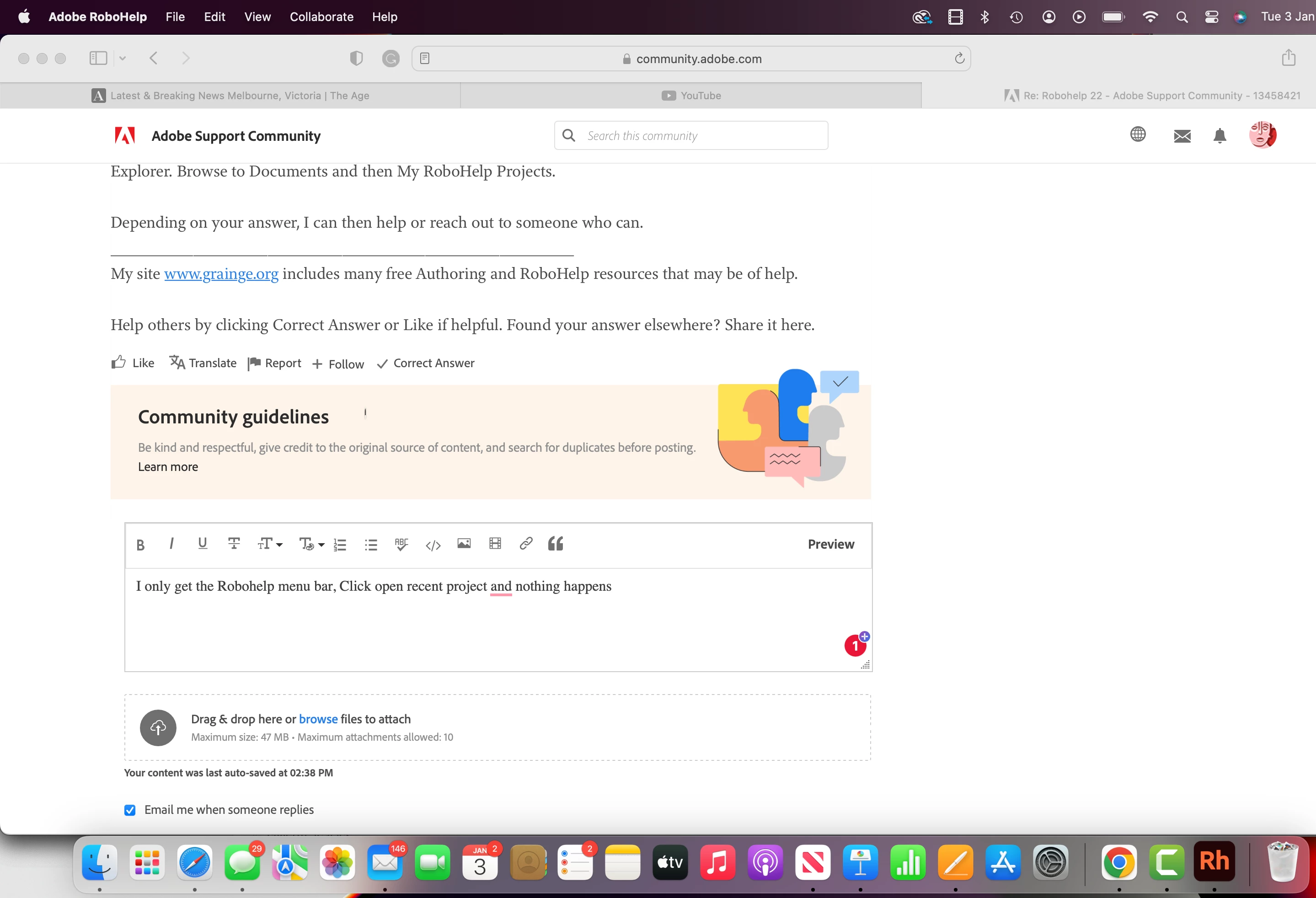I installed the Demo version on my M1 Macbook pro, and all was working well. I copied .htm files from a Flare project generated and viewed the project. Shut down and restarted my mac, and now I can't get RoboHelp to open any project. All I get is the Robohelp Menu bar and nothing else. Is this M1 vs Intel issue on the Mac? Any help is most welcome.