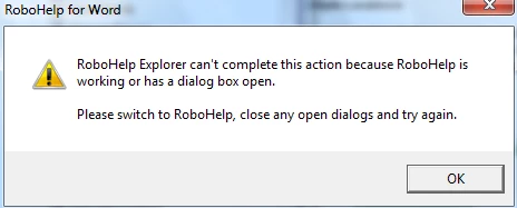 I just upgraded everything: Win7, Office 2010, RH 9 from RH 8. I first installed RH8 on this new system so I could install RH9 as an upgrade. Once that was done, I uninstalled RH8. Now I can start RH9 and it opens Word to show my default opening document. The RH toolbars are visible in the Word pane, but none of the options are functional. When I try to open a different document in the project, I get the messages below. There are additional errors from Word, which has to close itself and open again with a restored document.