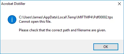 A FrameMaker book is linked into a project in RoboHelp. The project is set up with Use Distiller to Generate Images checked. Do Not Regenerate Images is left unchecked. Until June this year the project would generate correctly, with Distiller popping up regularly to generate a PDF from a TPS. This week we have several projects to regenerate for a major product release. When I choose Update > Force Update on the book file, generation starts, but as soon as Distiller starts it produces an error message saying 'C:\...\Pdf000002.tps Cannot open this file. Please check that the correct path and filename are given.' The generation stops unless you click OK, and if you do click OK immediately produces the same error message, and stops again. If I unselect Use Distiller to Generate Images then the project generates, with poor image quality. The .tps file is in the quoted temporary directory and can be opened manually in Distiller.