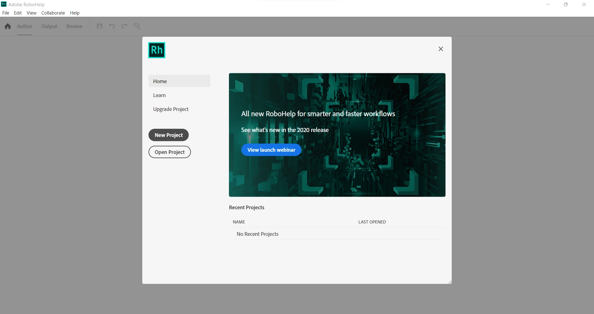 I have installed RoboHelp for the first time. When I opened the application it gets stuck, for example, whether I click New Project or Open Project or Import, etc. It is not responsive at all. Tried restarting the application several times but it does not work. Please find the attached screen capture for a better understanding.