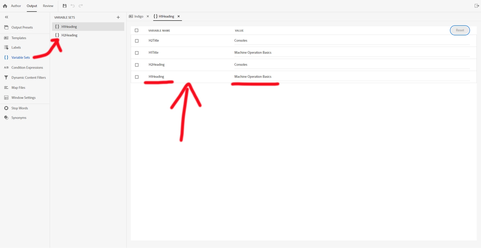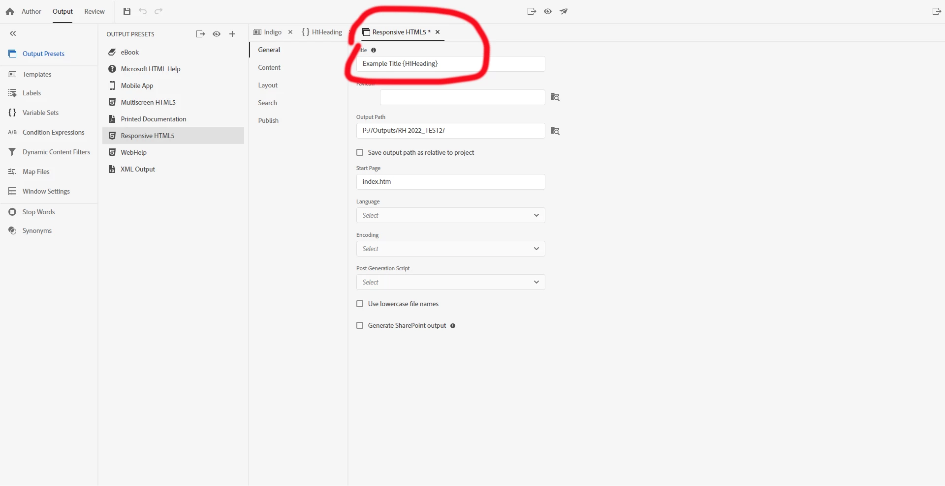 We want the Page title on our html pages to be the H1 or H2 heading of each article. We highlighted the headings created variables and then added them to the title field before exporting. something like {TitleHeading} . However when exporting the page title just shoes the {TitleHeading} not the actual variable and says "Variable not defined" . When we go back and look at the variables in robohelp the name and correct values are there. Is there something additional needed for the HTML export for that to pull correctly?