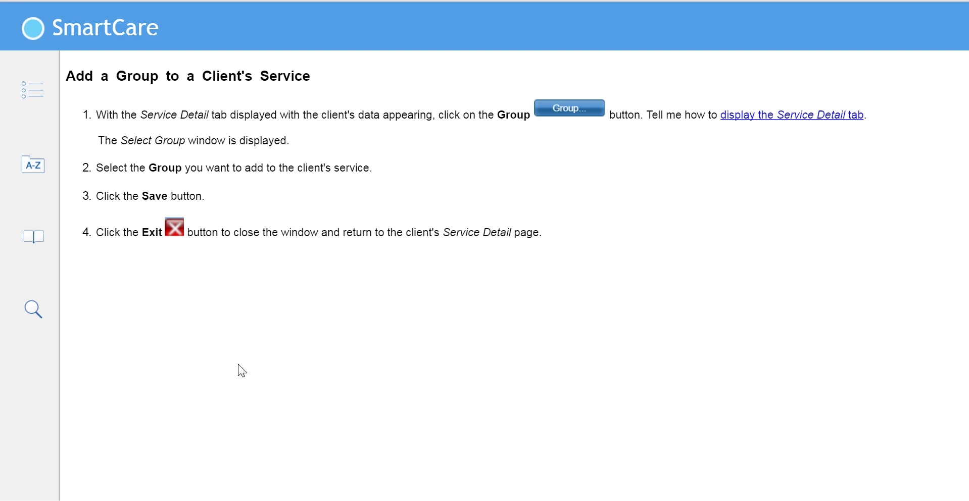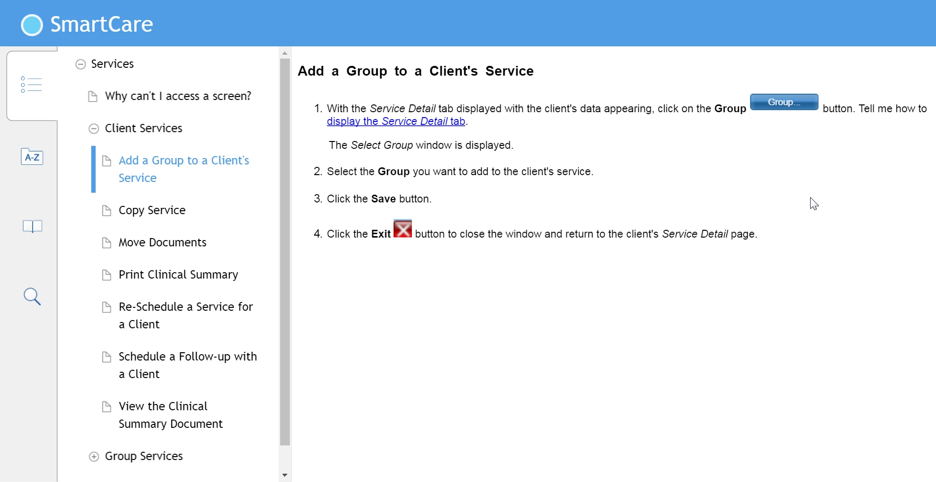 Desired TOC display, but with Services topic showing, not Add a Group to a Client's Service.