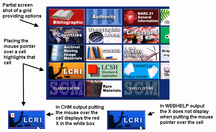 In the CHM output when you place the mouse pointer over one of the cell graphics the tinted image displays, but it also displays a small square with a red X in it, which has always meant to me that the image wasn't found or some error is occurring.