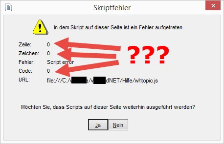I'm working with a project that contains Map IDs for context sensitive opening of topics. All of a sudden, we seem to have a problem when a context sensitive topic is being opened, but only, when this topic contains an embedded video (iFrame), which is linked to our channel on YouTube (when I delete the embedded video, the error does not pop up anymore, so the reason for this problem has to be the video). I'm getting a script error regarding the file whtopic.js, but this script error is not really helpful, because it only shows 0 for line, character and code (see Image below):