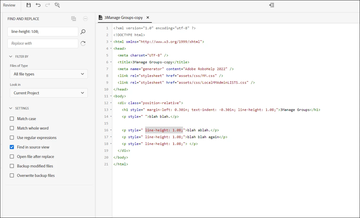 Search and Replace not working to clean up Source view