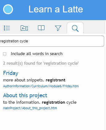 In Learn a Latte I entered text to two topics that I knew wouldn't appear in the projects. In one topic I entered "registration cycle" without quotes and in another topic I entered "registrant" without quotes. In the preset I turned off "Auto correct search query" and  "Enable substring search", thinking those might have some effect on "fixing" "incorrect" searches.