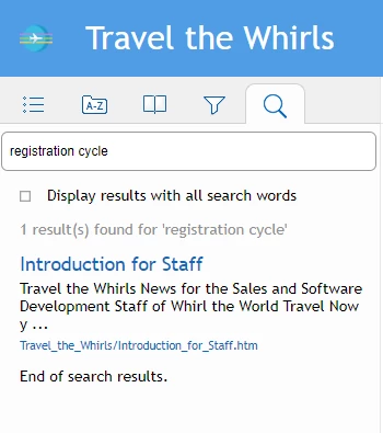 Then I used Travel the Whirls in Classic and did the same thing. I turned off "Enable substring search" as well. This time, only the topic containing "registration cycle" was returned.