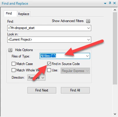 Is there a way to search for drop down hotspots? When I started my project, I used drop down hotspots and realized this configuration wasn't going to work well. I converted most of them, but would like to search the entire project to ensure I found and converted all hotspots.