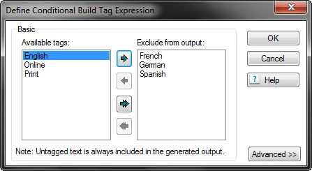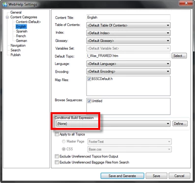 When you look at the Single Source Layout settings, expand your Content Categories and select one. Note that for each of these, you have an ability to choose a Conditional Build Expression.