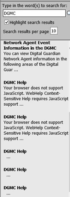 - For example, if I type "DGMC" into the Search field, the search lists topics that have this acronym, as expected. But it also lists "Home > DGMC Help," which is not a topic: it's the title of the Help. A couple of the results also display the message "Your browser does not support JavaScript," etc. The browser does support Javascript and overall the Help works fine. (screenshot 1)