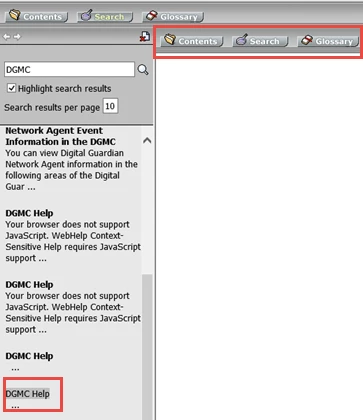- When you click one of the "DGMC Help" results, you get a blank topic with "DGMC" highlighted in the browse sequence, Or you get a blank topic showing the Contents, Search, and Glossary buttons. (screenshots 2 and 3)