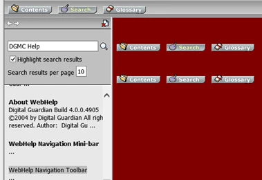 - If you type "DGMC Help" (not just "DGMC") into the Search field, you get the original blank or weird "DGMC Help" entries, but you also get a couple of "WebHelp Navigation Toolbar" and "WebHelp Navigation Mini-bar" entries. When you click the "Web Navigation Toolbar" entry, it returns a bright red screen with two rows of Contents, Search, and Glossary buttons. (screenshot 4)