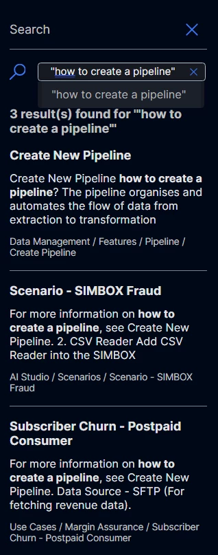 I was checking the search results and I found that for Phrase search we need to put quotes. I have attached two screenshots to show the difference. In the first image_1, I entered the search query How to create a pipeline without quotes and it generated 236 results. In the second image_2, I entered the same search query with quotes and it yielded 3 results.