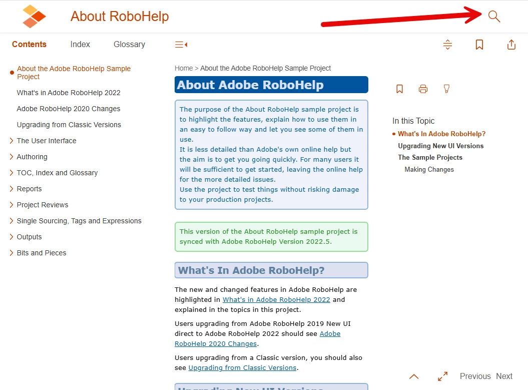 When I generate and publish the Frameless output, everything seems to work as expected with the exception of the Search. I see the Search icon in the upper, right corner of the page. I don't see the actual Search text field. When I click the Search icon, expecting for the Search text field to display on-screen, it briefly displays along the header of the page and then just as quickly disappears.