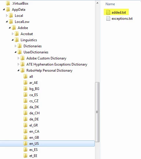 The text file is an alphabetized non-delimited file containing all the words that have been added. Based on the other language files it appears the file is empty when RH is first installed so I don't think there's a default list for the spell check functionality. Also, all words added from all projects are in this same file - not sure what Adobe was thinking but I digress.