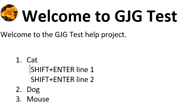 When in a bulleted/numbered list, I use SHIFT+ENTER to create a new line under the same bullet/number like this: