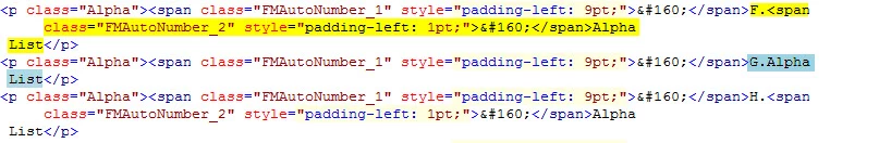 I'm single-sourcing my FM book into RH (TCS version 2015). I've auto-mapped my FM paragraph styles in RH, and in the Conversion Settings, told RH to Convert Autonumber to Text. This has worked perfectly, except for one weird thing: if I have an alpha list that extends to G, the space between the period and the following text disappears. When looking at the HTML for the list, it looks like this: