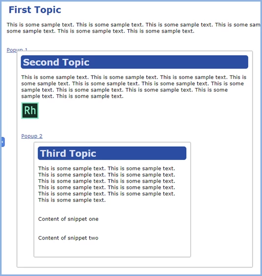 Add a hyperlink to text in a topic and have that hyperlink point to another topic that also contains hyperlinks. The popup opens as expected and displays the correct topic, but the links inside the popup do NOT work - they are dead even though in the preview they work just fine. In the actual output that is displayed in a browser, they are dead.