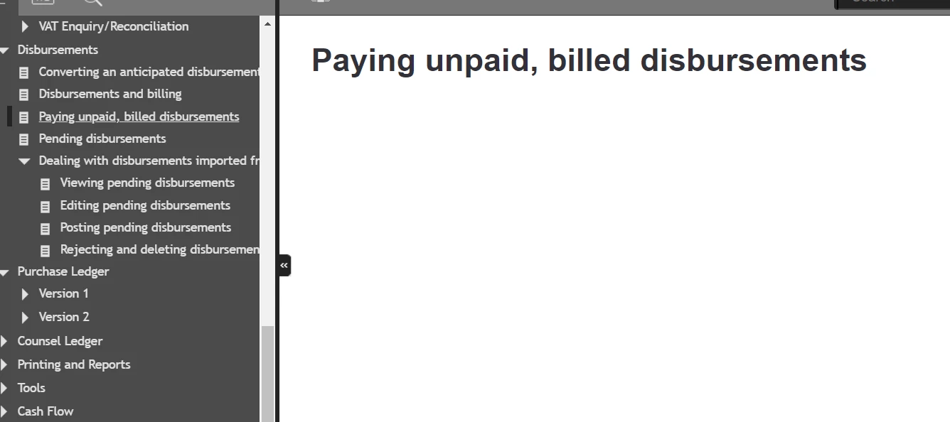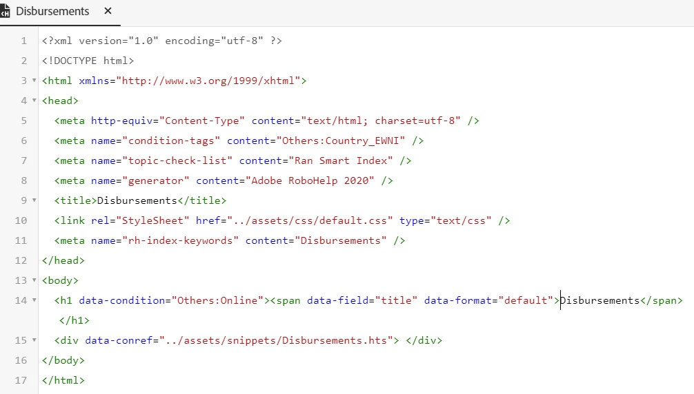 To correct this, Snippets were used in topics so that the titles would be correct. Variables were used to then change the text so that when you look at a Disbursment topic, you see the word Disbursment by using Conditional Text within the variables.