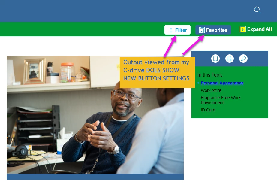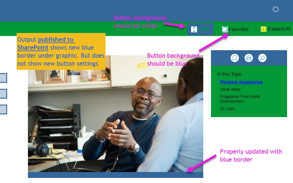 In RH 2020.6.76, I'm viewing new output in two ways: from my C-drive and from SharePoint Online. Output from my C-drive looks perfect. Output published to SharePoint Online is showing some changes but not others. (Please see two screenshots.)