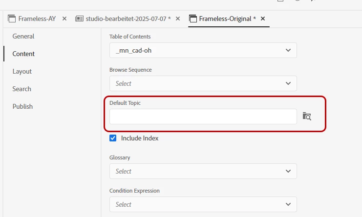 However, it does not open in other situations. Instead, the first topic of my project opens. (I have not selected this anywhere, see my settings in the attached screenshots).
